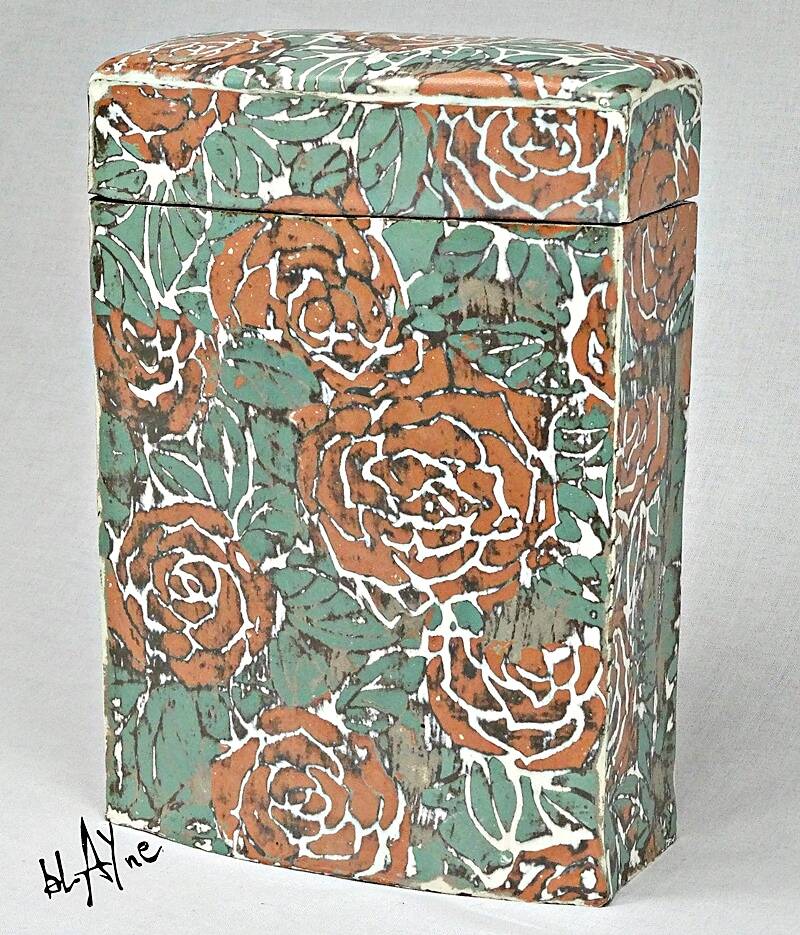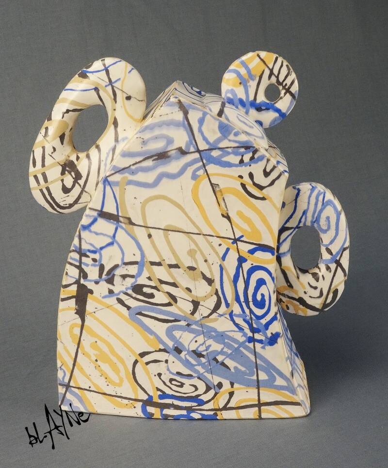 Eng: This is a method of slip decoration where the slip makes up the last outer thickness of the piece. It is done basically the same as mono printing. Here the object was to be able to produce the same art as artists can paint on a canvas.